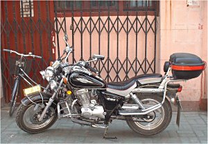 The thing about Chinese motorcycles (and indeed Chinese vehicles in general) is that they're made to be easy to maintain, and very cheap to drive, so they have very small simple engines. Actually it's a national law that the motor on anything with two wheels has to be 150cc or less. Three wheelers can be up to 750cc (though I think that some of the three wheel trucks must have bigger engines.) China as a nation can't (yet) afford the luxury of every person driving