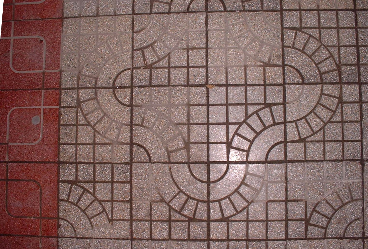Beijing Sidewalk (4) Another Beijing sidewalk. The same tiles as elsewhere, but arranged into a sort of undulating square pattern. My camera doesn't have a real wide angle setting, so you can't see the entire pattern, but I hope you can get the idea.