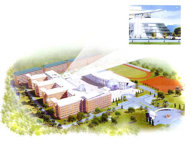 The Gold Apple Bilingual School has a Web Site. It's a masterpiece of what some people think a "cool" web site looks like. Big flash intro - Lots of pictures - animated graphics aplenty. There's even an "English Language Version" (Hope you like capital letters). Here's a futuramic picture of the campus that for some reason they removed from the web site.