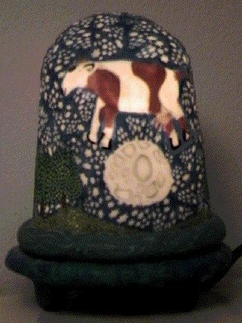 I made this lamp to celebrate the birth of my oldest/best friend Colin Taber's son Nicolas. The cow is a theme much beloved by Col's wife Lisa (Lisa Tracy the NYC actress), and since no child's home is complete without icons from ancient stories, it was a natural. The back is a hovering saucer because I like flying saucers (and I had the cane already made up).