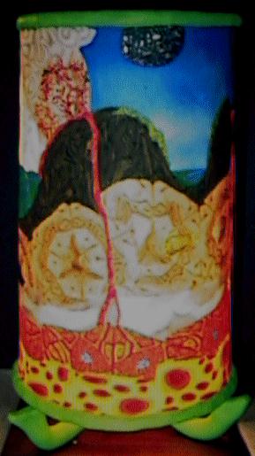 This view shows the volcano, a mountain lake, and a fuzzy moon.