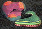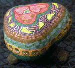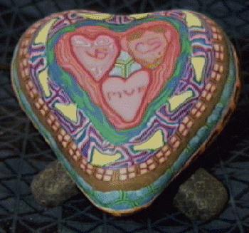I made this lamp as a Valentine for my wife Carol. There are three cardioforms on the top to represent Carol, myself, and our (then) newborn son Max. The lower half contains a chain of little houses (our house). These come from a cane I made for a broach. The heart stands on a small tripod that holds the bulb.